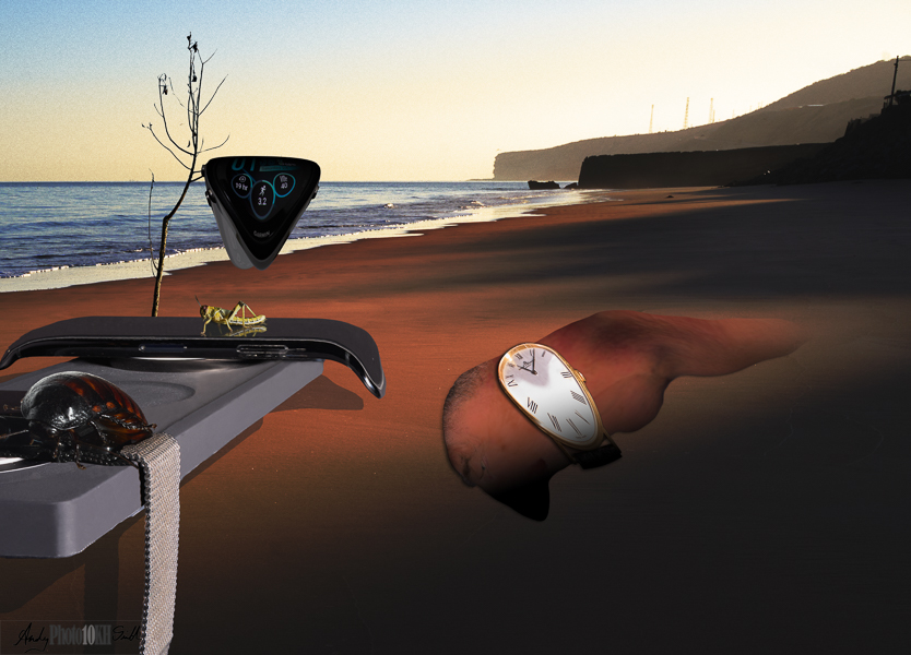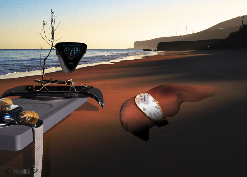 (½h) creating a background for my version of Dali’s “The Persistence of Memory” (right), and positioning my self-portrait in it