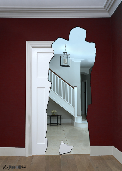 (2h) experimenting with a Magritte style shadows through the door such that the hole through the door tells a story